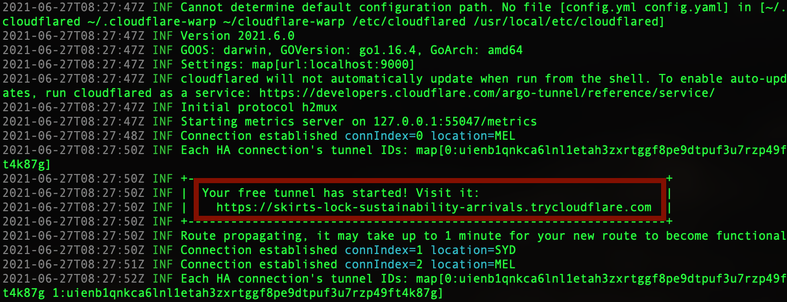 This will start argo tunnel which will generate a random subdomain when connecting to the Cloudflare network and print complete URL on screen for you to make use of. Since we supplied the local python server URL and port it will make it accessible from internet through the public URL only known to you. The output will look like following: